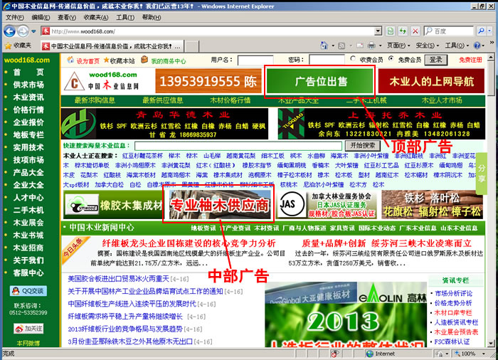 中國木業信息網首頁各種類型廣告尺寸及位置示范