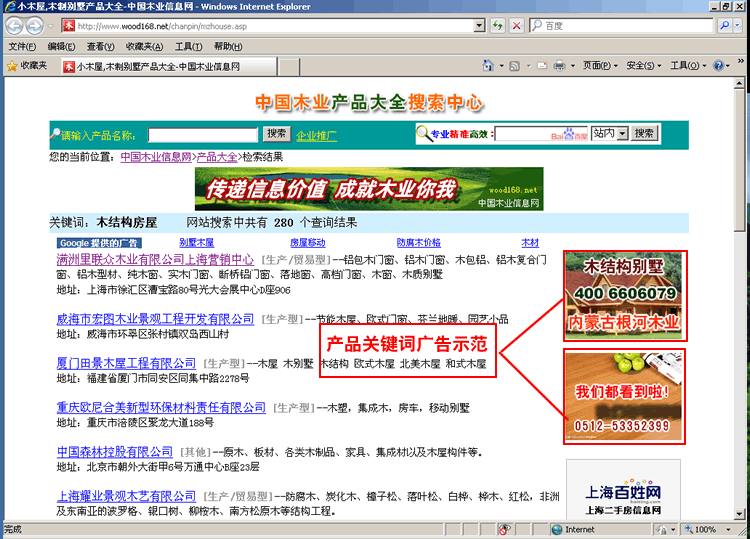 產品關鍵字廣告位于中國木業信息網核心欄目“產品大全”欄目中某一具體產品下,當客戶點擊后,此產品目錄下的關鍵詞廣告將始終出現搜索內容的右側。
