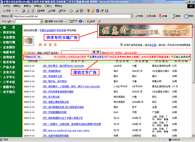 中國木業信息網供求市場廣告尺寸及位置示范